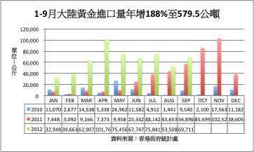 香港政府統計處11月5日公布的數據顯示,2012年9月份香港出口/轉口至中國大陸的黃金數量較去年同期的56,896公斤增加22.5至69,711公斤,較前月53,508公斤也增加30%;累計今年1-9月,大陸自香港進口的黃金數量達579,549公斤,較去年同期的201,060公斤大增188%,並且也已經超過去年全年的水平。大陸去年自香港進口的黃金年增260%達到428公噸。