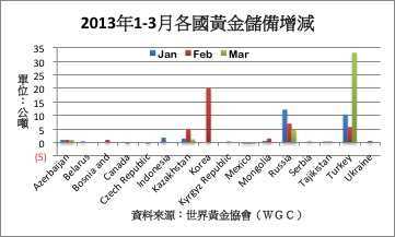根據世界黃金協會(WGC)的數據,土耳其與俄羅斯是2012年黃金儲備增加最多的兩個國家,去年黃金儲備分別增加164.3公噸與74.8公噸。WGC報告表示,2012年全球黃金需求年減4%至4,405.5公噸,但全球央行淨買入黃金數量則年增17%達到534.6公噸,創下1964年以來的48年新高,並佔整體黃金需求的12%比重。