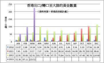彭博社5月24報導,香港金銀業貿易場表示,2013年前5個月,人民幣公斤條黃金合約的日均交易量為65億元人民幣(11億美元),為去年同期(18億元)的三倍。這一交易量也超出了2011年10月推出該合約時設定的49億元目標。